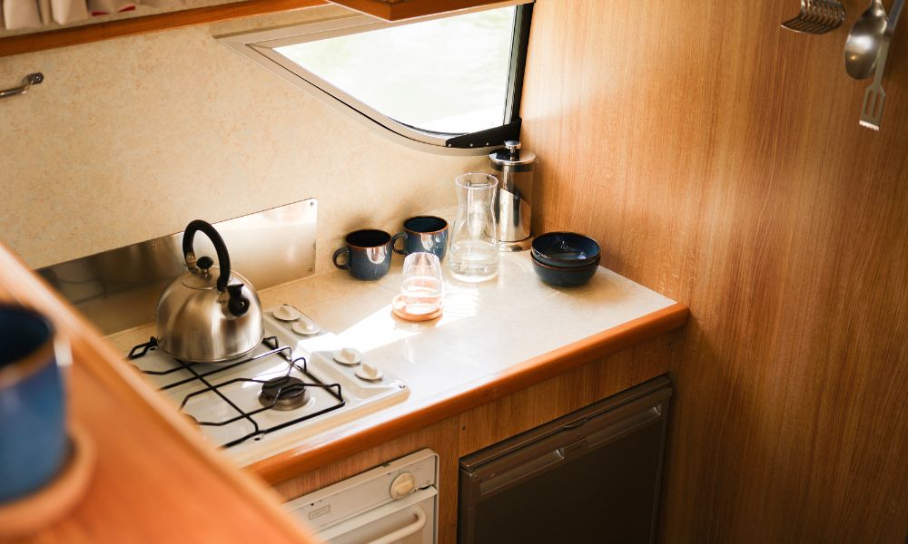Wohnraum/ Küche: Salon mit Tisch, Sitzbank, anschließender Küche, die vollwertig ausgestattet ist: Gasherd, Backofen, Kühlschrank, Spüle, Stauraum und Geschirr. Die Sitzbank kann zu einem weiteren Doppelbett umgebaut werden. Für Unterhaltung sorgt ein Bildschirm mit DVD Player und ein Radio mit CD/USB/MP3