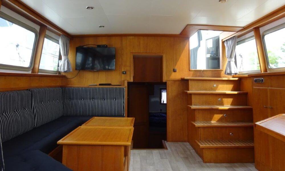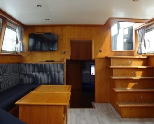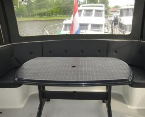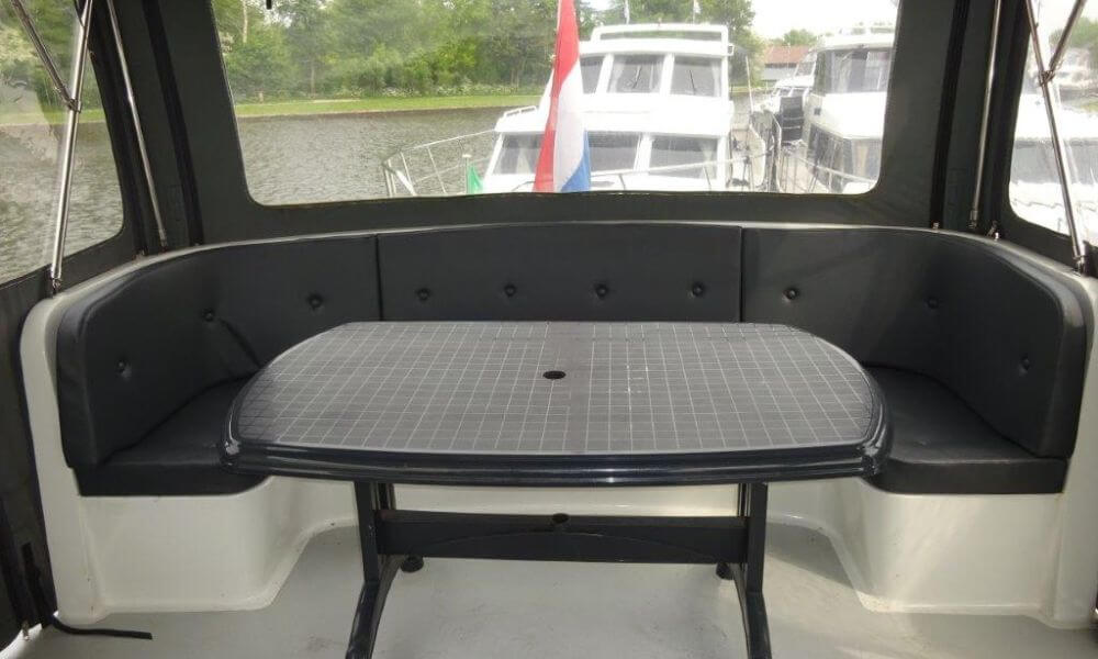 Im Außenbereich befinden sich eine weitere gepolsterte Sitzbank und der Steuerstand. Beides ist durch ein schließbares Cabrio – Verdeck vor Sonne, Wind und Wetter geschützt.