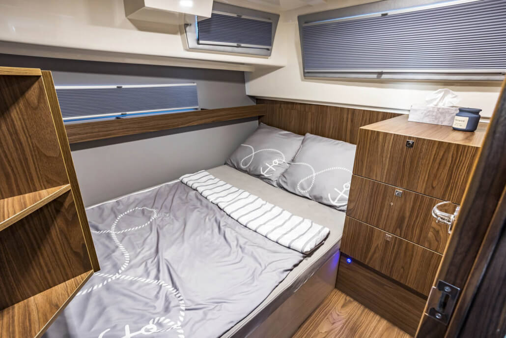 Sehr luxuriöses, modernes Boot mit 2 Schlafkabinen. Eine Doppelkabine befindet sich im Bug, die andere im Heck, so dass Privatshäre möglich ist. Das Sofa im mittleren Wohnbereich kann zu einem weiteren Doppelbett umgebaut werden. Jede Kabine verfügt über ein eigenes Bad mit abgetrennter Dusche.