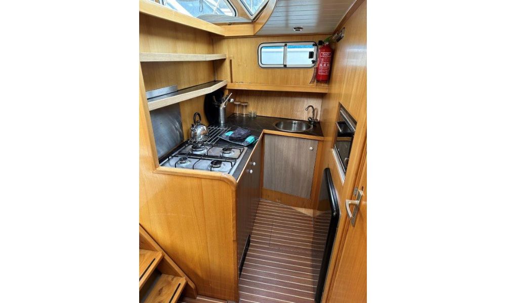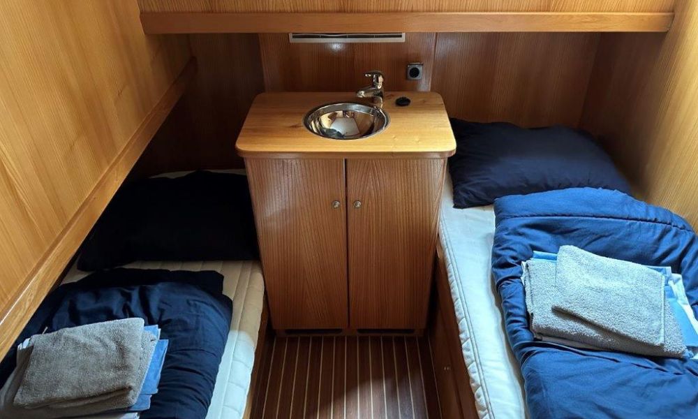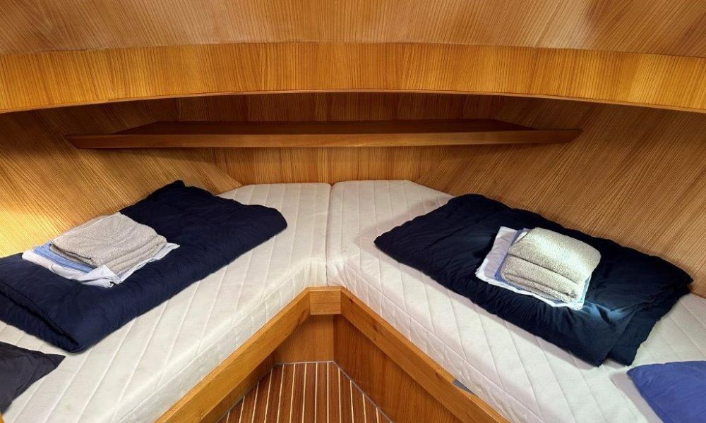 Die Mila Mae ist ein einfaches Boot für größere Gruppen. 12 feste Betten (2 Doppel- und 8 Einzelbetten) verteilt auf 6 Kabinen, die Sitzbank im Salon kann zu einem weiteren Doppelbett umgebaut werden. Alle hinteren Kabinen haben ein Waschbecken. An Bord sind eine Küchenzeile, ein Wohnbereich mit Essecke, 2 x WC und 2 x WC mit Dusche. Erhöhter Steuerstand mit guter Rundumsicht, Terrasse mit Außensteuerstand.